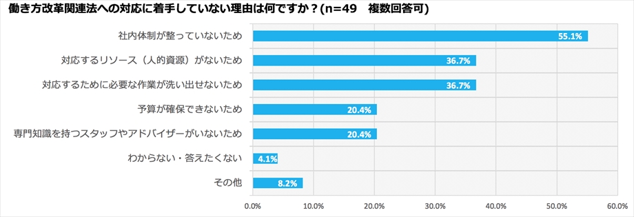 一方で、勤怠・就業管理システムの導入や見直しには、「導入までに時間がかかる」「コストがかかる」ため、目前に迫る関連法の導入に対して、早急な対応が求められる。未着手の理由としては「社内体制が整っていない」(55.1%)、「対応するリソース(人的資源)がない」(36.7%)、「対応するために必要な作業が洗い出せない」(36.7%)など、通常業務に加えて法対応の負荷が割けない状況がうかがわれる。労務管理システムのアップデートで、課題のいくつかが改善可能と多くの企業が認識していることでもあり、その注力を急ぐことが働き方改革関連法対応に取り組むための第一歩となっていくのではないだろうか。