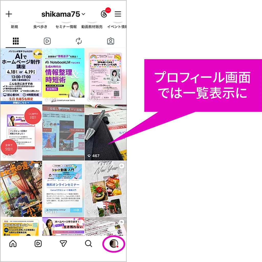 フィード投稿はInstagramの基本となる投稿形式で、プロフィールと一緒に蓄積されていくのが最大の特徴です。「あとから見返されることを前提としたコンテンツ」であり、アカウントの世界観や信頼を形作る役割を持っています。これらの投稿は削除しない限り、ずっとプロフィール欄に表示され、他のユーザーがいつでも閲覧できます。