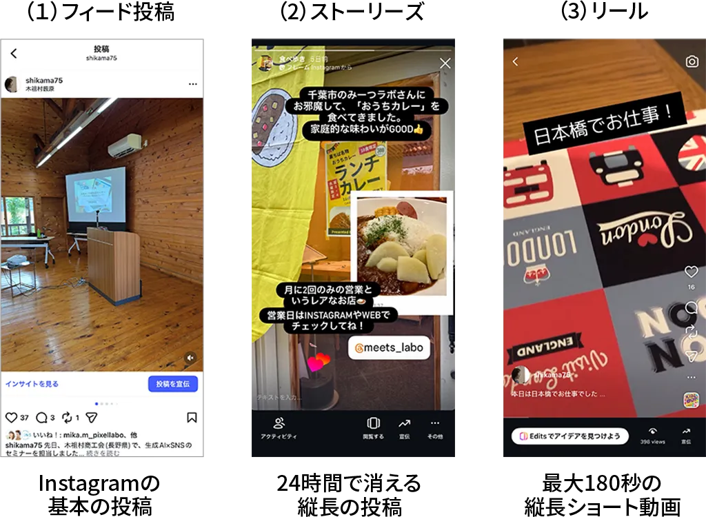 Instagramを運用するうえで欠かせないのが「投稿形式ごとの役割の違い」を理解することです。一見すると同じ投稿のように見えますが、フィード投稿・ストーリーズ・リールはそれぞれ仕様が異なり、届き方や目的も大きく変わります。
