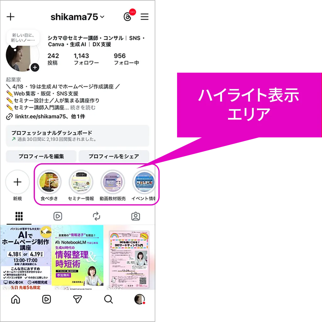 投稿自体はアプリ内に残っており、「ハイライト」機能を使うことで、あとからプロフィール欄の下部に表示させることができます。