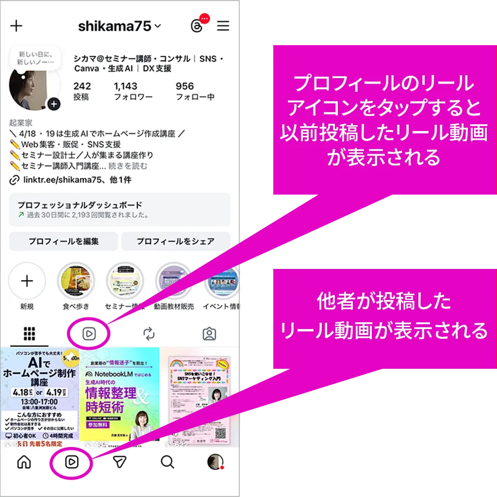 リールは、Instagramの中でも最も拡散力が高い投稿形式です。最大の特徴は、フォロワー以外のユーザーにも広く表示される点にあります。