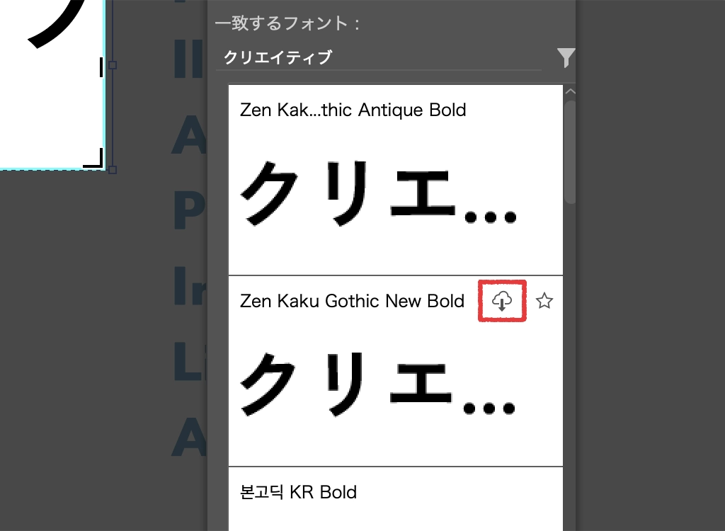 候補の中でアクティベートされていないAdobe Fontsは、その場でアクティベートして使用することが可能です。