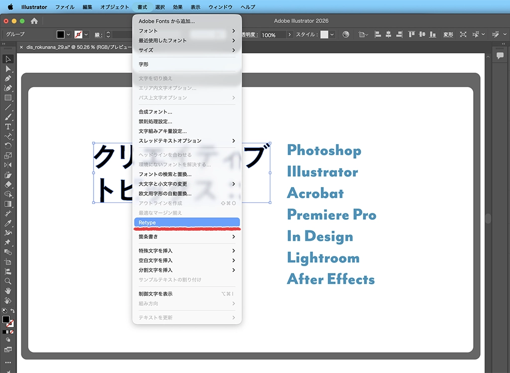 Adobe Illustratorで、検索したいフォントが含まれた画像を開きます。画像を選択し、[書式]メニュー→[Retype]をクリックします。