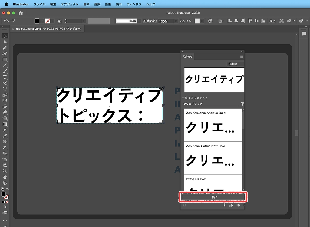 自動でフォントの識別が始まり、[Retype]パネルが開きます。パソコンに入っているフォントとAdobe Fontsの中から、認識されたフォントの候補が表示されます。