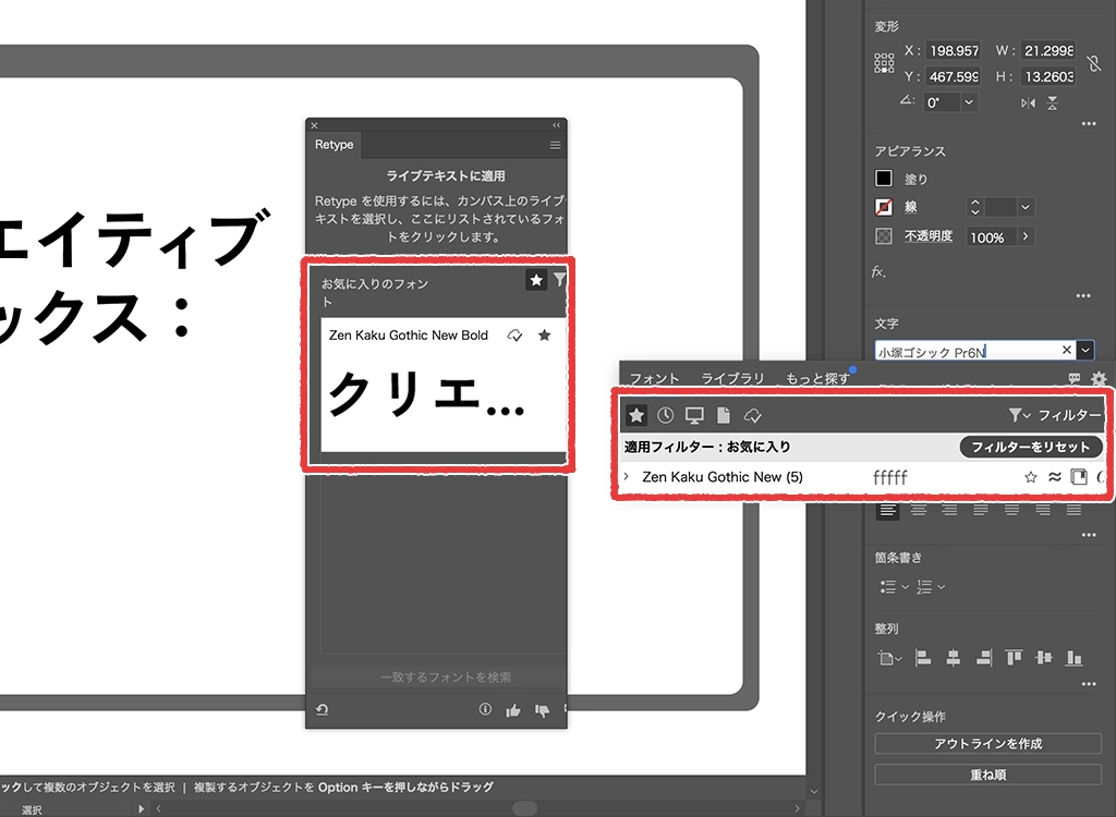 お気に入りに登録したフォントは[Retype]パネルに表示されるほか、フォントファミリーを設定する際にフィルターを適用することができます。