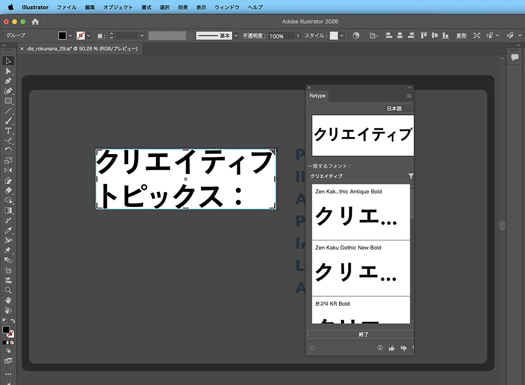 今回は、Adobe Illustratorのフォント検索機能「Retype」について紹介しました。地味で時間のかかる作業だったフォント探しが一瞬で解決することで、作業効率アップにつながります。また自身のお気に入りのフォントを探すのにも活用できそうです。ぜひ一度、気になるフォントを見つけたときに使ってみてください。