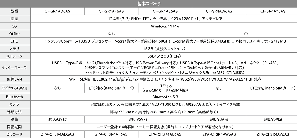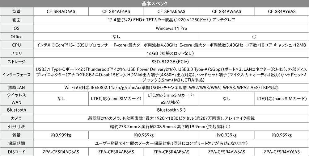 SRは12.4型の高性能コンパクトPCで、持ち運びが多いユーザーにおすすめの1台。A4用紙よりも小さく1kg未満の軽量ボディでストレスなく持ち運ぶことができ、頑丈で故障のリスクを低減します。また長時間駆動が可能なため、電源の確保が難しい場合でも安心。Thunderbolt™ 4対応のUSB3.1 Type-C®ポートやVGAポート、SDカードスロット、USB3.0ポートなど豊富なインターフェースで周辺機器との接続も容易です。オフィスや自宅、出張先やカフェなど、様々な場所で効率的に作業を行うことができます。