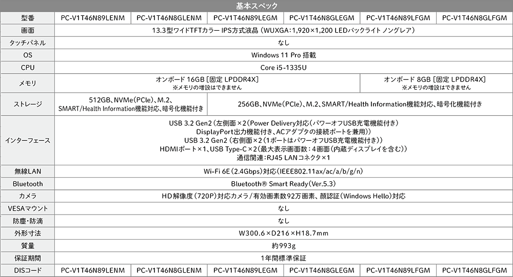 デスク業務の使いやすさとスムーズな持ち運びを両立するスリムベゼル採用13.3型WUXGA液晶を搭載。