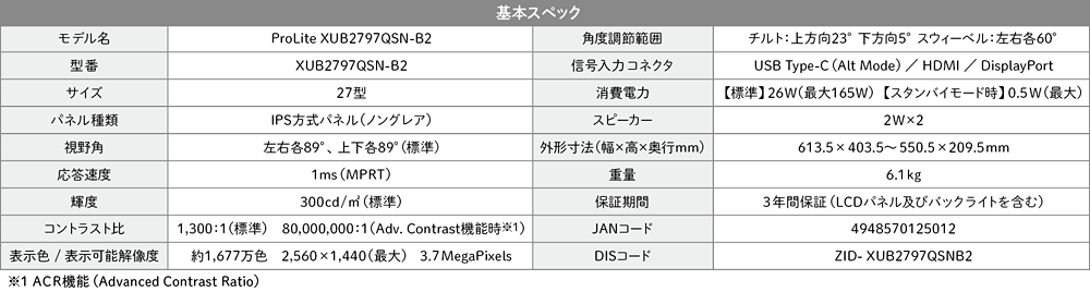 ProLite XUB2797QSN-B2は、業務効率を高めるための機能を多数搭載した27型WQHD液晶ディスプレイです。USB-Cによる映像出力・データ転送・最大65Wまでの給電を一括接続、LANポートによる安定通信を実現し、モダンPCを活用するアクティブなビジネスパーソンのフリーアドレスオフィスの据え置きディスプレイにおすすめです。また、DisplayPort出力によるデイジーチェーン機能により手軽にマルチディスプレイ環境を都と寝られます。