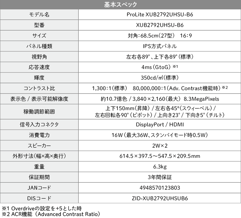 ProLite XUB2792UHSU-B6は、27型の4K解像度対応IPS方式液晶ディスプレイです。広視野角で色再現性に優れ、非光沢パネルにより長時間の作業でも目が疲れにくい設計でHDMIとDisplayPortで4K 60Hz入力に対応します。高さ調整・ピボット・スウィーベルなど多機能スタンドを搭載し、作業環境に合わせた柔軟な設置が可能です。