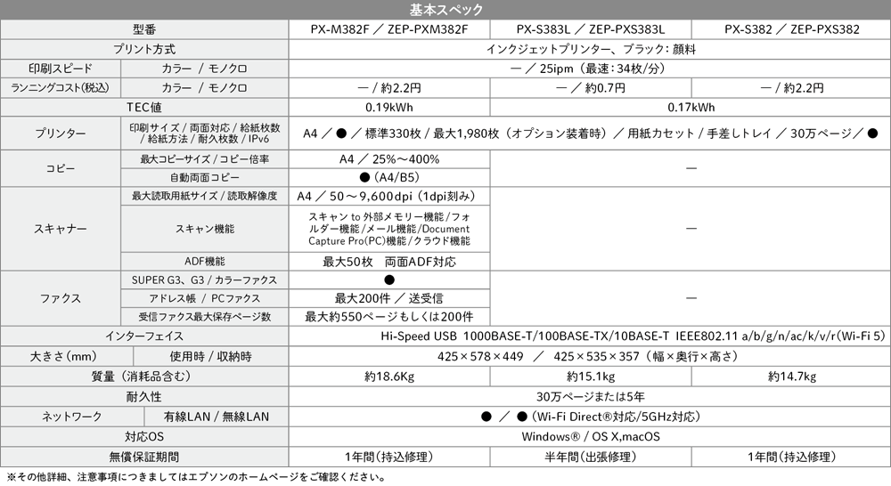 PX-S383Lは、エプソンのA4モノクロインクジェットプリンターです。省スペース設計により、病院や店舗のバックヤードなど限られたスペースにもすっきりと設置できます。また、大容量インクパックを同梱しているため、購入直後から大量印刷が可能です。最大30万ページの高耐久設計と交換式メンテナンスボックスにより、長期運用にも対応します。高速印刷や大容量給紙にも対応し、業務効率と環境配慮を両立した一台です。他にもPX-M382FやPX-S382など、機能やコストに応じて選べるモデルがございます。
