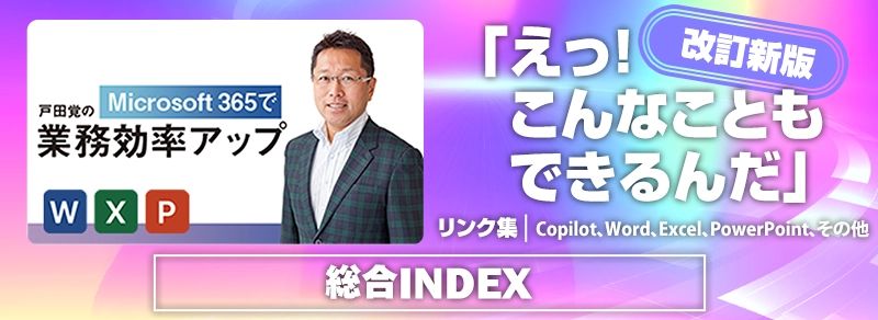 戸田覚の「Microsoft 365で業務効率アップ!」 特別編 改訂新版「えっ! こんなこともできるんだ」リンク集-総合INDEX 2025.10.14 25 Microsoft 365 Copilot Word Excel PowerPoint INDEX 戸田覚 Post シェアする 戸田覚の「Microsoft 365で業務効率アップ!」の連載も300回を超え、読者は知りたい便利機能を探すのも大変になってきたのではないだろうか?これまで紹介してきたMicrosoft 365の機能をアプリケーション別にINDEX化してリンク集を作成した。今回新たに、Copilotの章も追加した。利用目的に合わせて、さらなる業務効率化のためにお役立ていただきたい。 編集部 前回の記事 次回の記事 Post シェアする 特別編 改訂新版「えっ! こんなこともできるんだ」リンク集-その他編 特別編 改訂新版「えっ! こんなこともできるんだ」リンク集-PowerPoint編 特別編 改訂新版「えっ! こんなこともできるんだ」リンク集-Excel編 戸田覚の「Microsoft 365で業務効率アップ!」 一覧