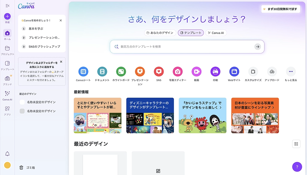 Canvaは61万点以上のテンプレートと1億点以上の素材が利用可能で、SNS用画像やプレゼン資料、ポスターなど多様な用途に対応しています。無料プランでも十分な機能が使えるため、個人利用からビジネスまで幅広く活用できます。