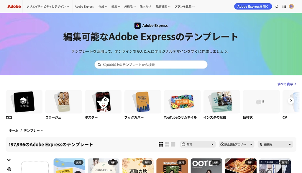 Adobe Expressは35万点以上のテンプレートと3億点以上の素材を提供し、Adobe StockやAdobe Fontsと連携することで商用利用にも強みを発揮します。Creative Cloud契約者は有料素材も追加料金なしで利用できるため、より高品質なデザインを求めるユーザーに適しています。
