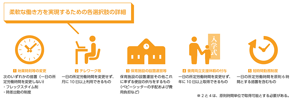 柔軟な働き方を実現するための措置等において、事業主は3歳から小学校就学前の子を養育する労働者に関して、五つの「選択して講じるべき措置」の中から、二つ以上の措置を選択して講じる必要がある(図参照)。
