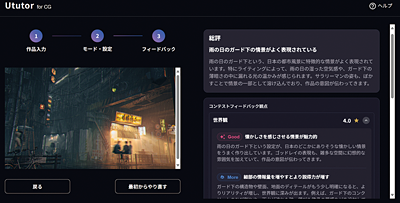 本体験発表会では、実際にUtutorの画面を見ながらの操作説明も行われた。デジタルハリウッド大学で3DCGなどの授業を担当する教授 小倉以索氏は、Ututor for CGを操作しながら、特長を次のように話す。「Ututorでは、フィードバックの厳しさを選べます。私は実際に3DCGの授業を受け持っていますが、若い学生の一部は厳しすぎることを言うと、へこんで授業に来なくなってしまうことがあります。そのため優しいフィードバックをもらいたい受講生は、『ノーマル』を選択できます。一方で、『ハリウッドでCG制作のプロになる』といった大きな夢を持つ受講生には、プロ向けの厳しい批評をしたいんですね。そうした受講生は『ハード』を選択すると、AIが厳しめのフィードバックを返してくれます」