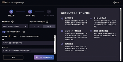 Ututorは現在、CG作品のフィードバックを行う「Ututor for CG」、グラフィック作品のフィードバックを行う「Ututor for Graphic Design」、Webデザインのフィードバックを行う「Ututor for Web Design」、動画制作へのフィードバックを行う「Ututor for Video Creation」の四つを用意している。それぞれ各ジャンルごとのデジタルハリウッド講師陣のナレッジを学習したAIが、アップロードされた作品に対して具体的なフィードバックをしたり、修正点の役に立つ動画教材を紹介したりする。なお動画教材は、デジタルハリウッドの動画学習教材「Any」からピックアップされる。