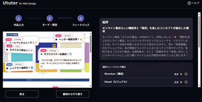 体験発表会の終わりにはデジタルハリウッド スクール事業部 小島千絵氏が登壇し、Ututor for Web Designのデモと、Ututorが学習フローの中で果たす役割についての説明を行った。小島氏は説明の中で、Ututorにおけるデジタルハリウッドならではの工夫をこう話す。「まずは、評価だけで終わらせない仕組みです。動画学習教材をデジタルハリウッドで作成しているからこそ、動画学習教材のテキストを全てAIに読み込ませることができています。これにより『この映像をどうぞ』のような曖昧な形ではなく、『この映像のこの部分を見てください』と詳細に伝えられているのです。次に、答えだけで終わらせない壁打ち型学習です。Ututorは入力欄を工夫し、作成した作品の目的やターゲットなども入力させるようにしています。実際の仕事現場で考えなければならない項目を受講生に記入させることで、考えを深めるプロセスを支援します」
