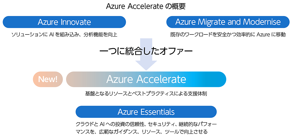 Azure Accelerateには大きく三つのメリットがあります。詳細は以下の通りです。併せて、それらを支援する体制も準備しています。