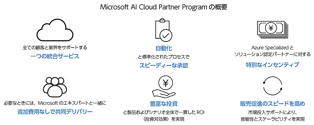 パートナーさまがあらゆるAzureのプロジェクト内で特定のマイルストーンを実行するために、プロジェクトのサイズと種類、プロジェクトのフェーズに応じた支援金を提供します。これには、PoV(Proof of Value)の構築や、Azure上でのソリューションの実装などが含まれています。こちらを活用することで、より迅速にビジネス成果を上げられます。そして、Azureクレジットも準備しており、導入コストを抑えながら迅速なクラウドに展開できます。無料のオンデマンドコンテンツや組織の学習を支援するためのトレーニングも提供しています。またその中にはAzureの資格取得のための準備も対象に含まれており、社内の皆さまのスキルアップの実現が可能です。