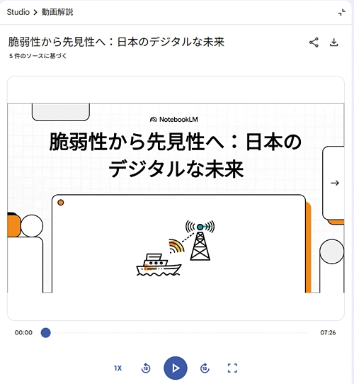 研修動画、製品デモ、Webセミナーなどのビデオをソースとして追加すると、NotebookLM は映像と音声を解析し、タイムスタンプ付きの詳細な概要を作成します。これにより、動画コンテンツ全体を見返すことなく、特定のセクションで何が語られているかをテキストで素早く確認し、必要な情報へ直接ジャンプできます。これは、情報収集や学習の効率を劇的に向上させるまさに革命的な機能と言えるでしょう。