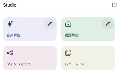 Studioは、アップロードした資料群から、以下のような多様な形式のドキュメントを自動で生成する機能です。