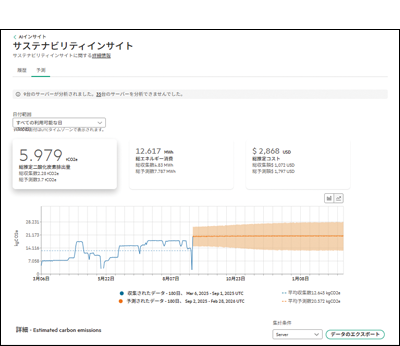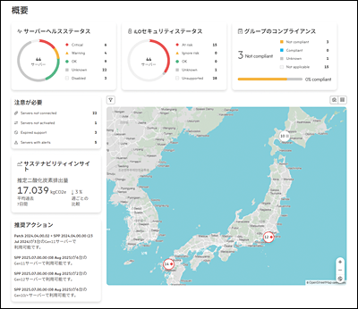 ProLiant Gen12でのCOMのアップデートとしては、AIによるインサイトを活用して、将来のエネルギーコストとCO2排出量を予測する機能が追加された。過去のデータからサーバー利用状況の予測も可能となっており、閾値を設定することでエネルギー効率の改善を支援する。また、「グローバルマップビュー」の機能により、分散設置されたIT環境をマップ上で可視化し、サーバーの動作状態をリアルタイムで確認できるようにもなった。