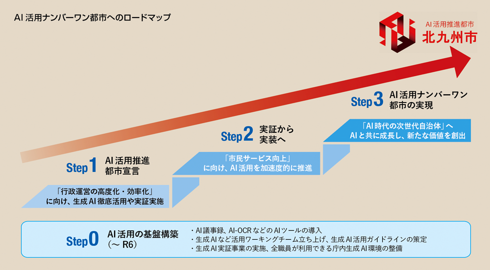 髙塚氏は、北九州市がAI活用ナンバーワン都市を目指すためのロードマップをこう説明する。「ロードマップは3ステップあります。Step1は、AI活用推進都市宣言です。行政運営の高度化・効率化に向けて、生成AIの徹底活用や実証実験に取り組みます。Step2は、実証から実装への活動です。行政運営が高度化・効率化された後は、市民サービスの向上を目指すAI活用を実装段階に進めていきます。Step3は、AI活用ナンバーワン都市の実現です。AI時代の新しい自治体のモデルを作り、市民の体験を変えていきます。またこれら3ステップのほかに、2024年度までに実施していたこととして、Step0もあります。Step0では、AI議事録、AI-OCRなどのAIツールの導入をはじめとした事柄に取り組んでいました」