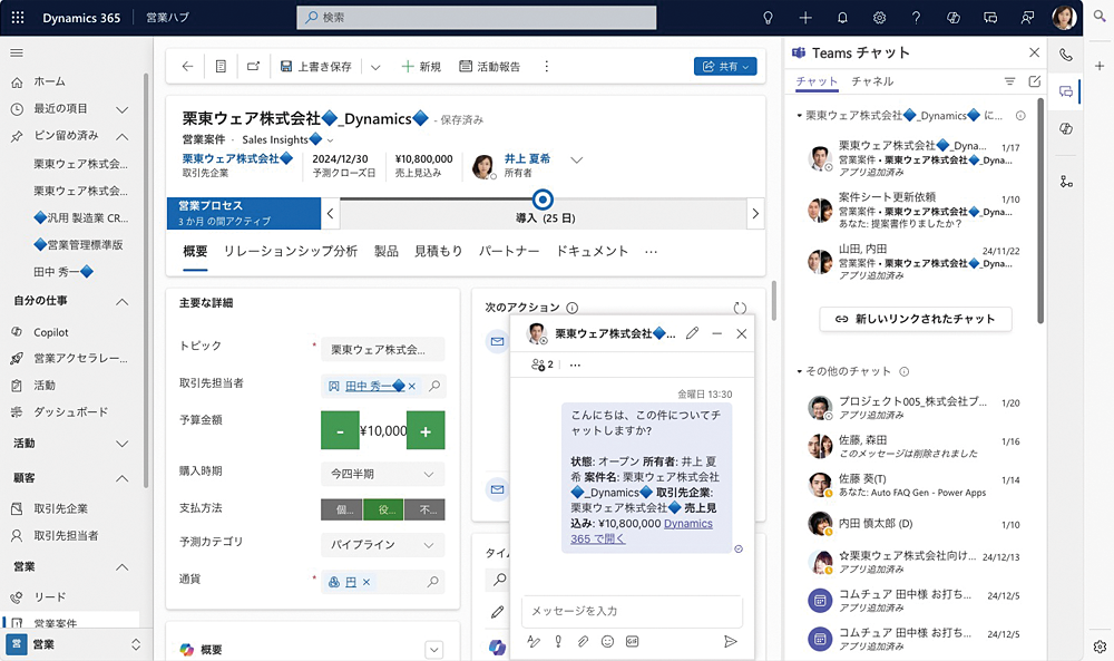 営業活動を通じて蓄積したデータは統合・可視化できるため、活動履歴や商談ステータスなどをチーム全体で共有することで、営業効率を高められる。また、「Microsoft Outlook」や「Microsoft Teams」と連携することで、メールや予定表、チャット、会議などの情報をDynamics 365 Salesにひも付けることが可能だ。営業担当者は顧客とのやりとりと関連する商談情報の把握が容易になり、迅速かつ的確な対応が行える。