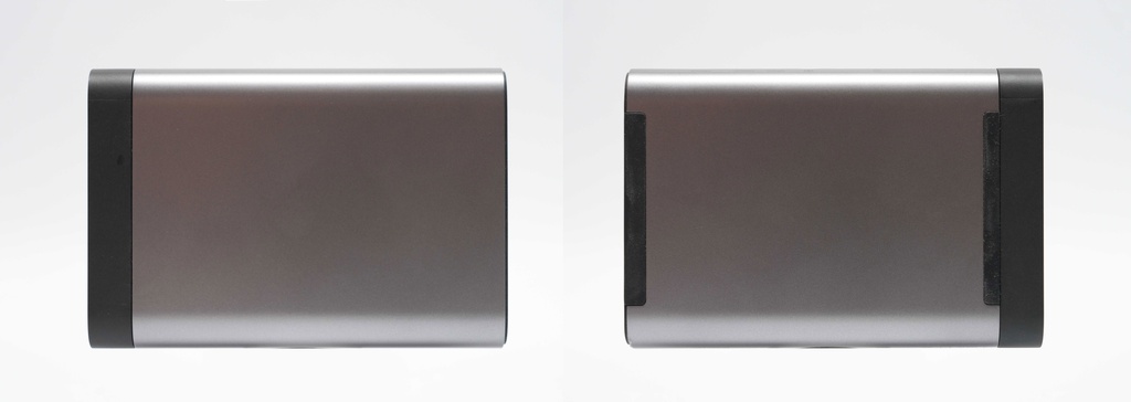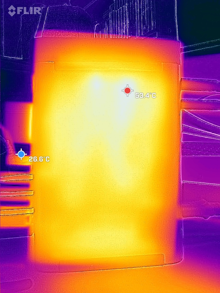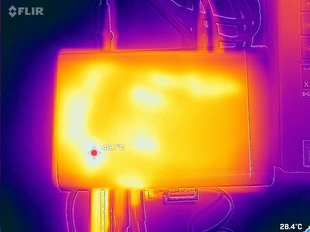 本体の発熱については、天面の最大温度は46.7℃、底面の最大温度は53.4℃となりました(室温27℃の部屋で4時間放置)。150WのGaN電源を内蔵しているので、このくらいの発熱は予想の範囲内。ただし今回はHDMI×2と、有線LANを使用していません。すべての端子に接続した際にはもっと温度が上昇する可能性が高いです。