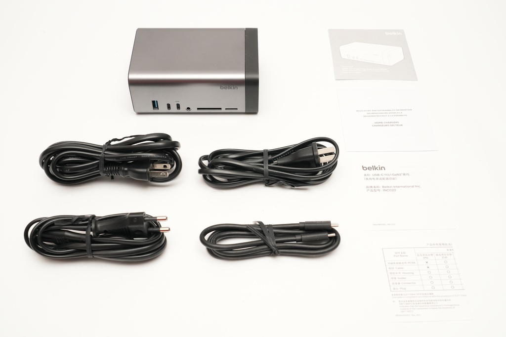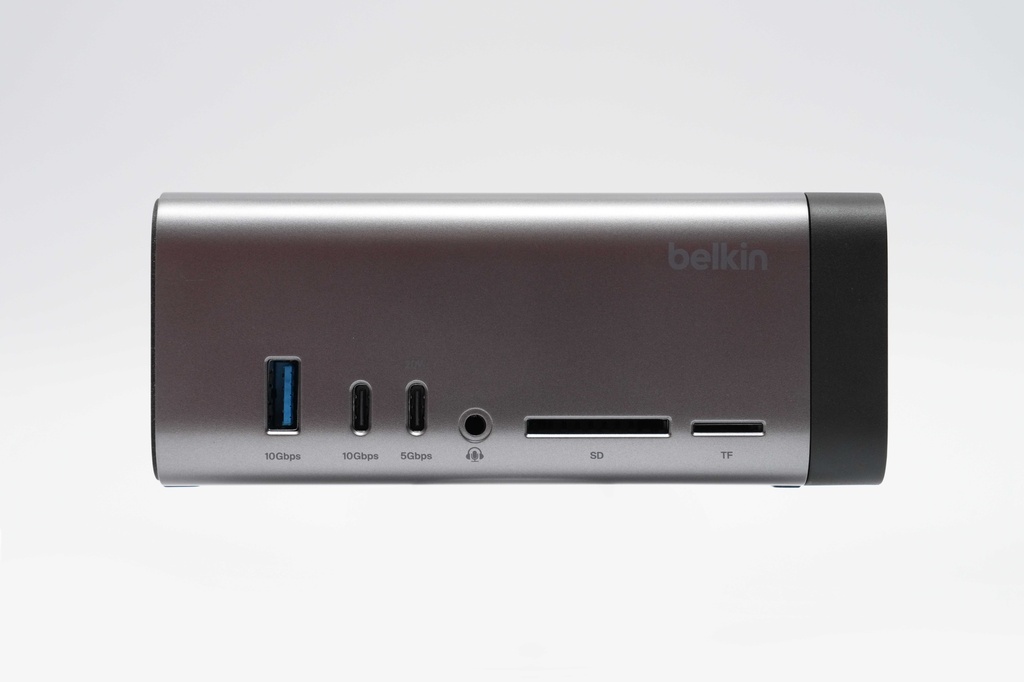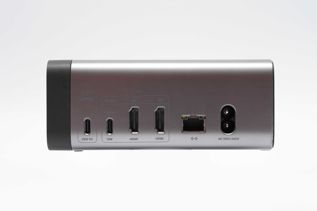 端子は前述のとおり11個も搭載。前面にはUSB 3.2 Type-A(10Gbps、7.5W)×1、USB 3.2 Type-C(10Gbps、7.5W)×1、USB 3.2 Type-C(5Gbps、20W)×1、3.5mmオーディオコンボジャック×1、SDメモリーカードスロット(USB 3.0)×1、microSDメモリーカードスロット(USB 3.0)×1、背面にはUSB 3.0 Type-C(PowerDelivery 96W)×1、USB Type-C(DisplayPort Alt、8K@30Hz/4K@120Hz、10Gbps、15W)×1、HDMI 2.0(4K@60Hz)×2、有線LAN(1000BASE-T)×1を配置。USB Type-AとUSB Type-Cそれぞれの仕様が異なっているのは少々複雑ですが、端子付近に仕様が記載され、グループ分けもされているので、挿入前に確認すれば迷うことはないはずです。