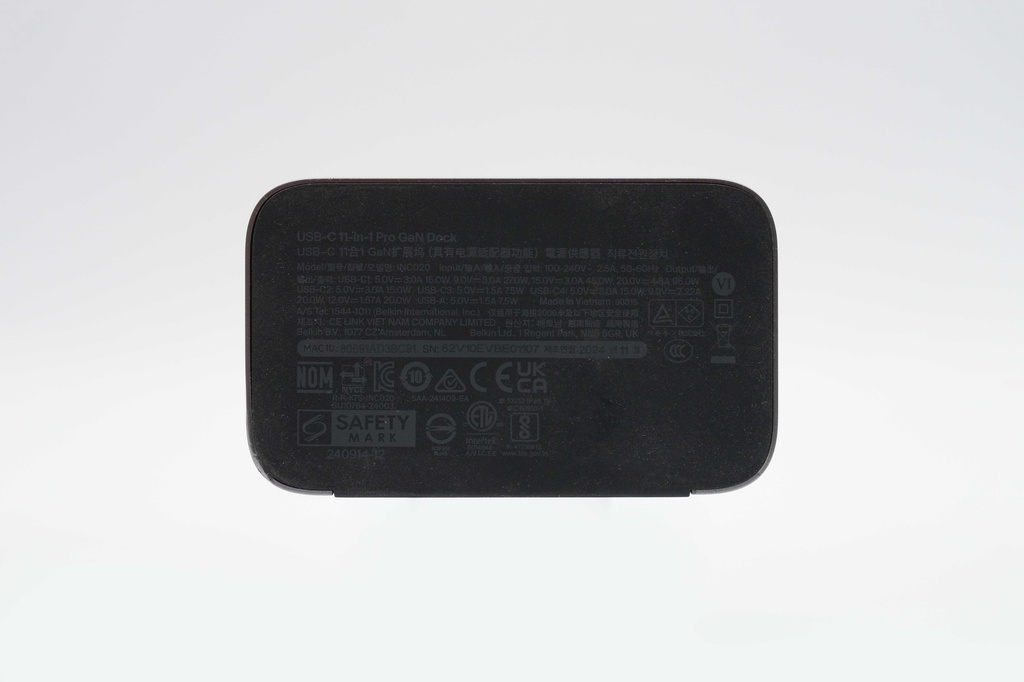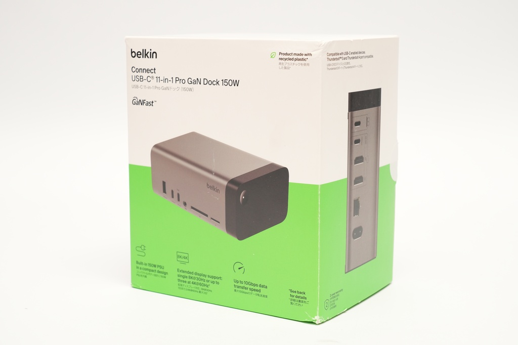 ベルキン「USB-C 11-in-1 Pro GaNドック(150W)」は1本のUSB-CケーブルでノートPCに接続することで、11個の端子を増設できるUSBハブ。製品名のとおり150WのGaN(窒化ガリウム)電源が内蔵されており、146W Power Deliveryに対応。ノートPC(ホストデバイス)に最大96W、周辺機器に最大50Wの電力を供給可能です。