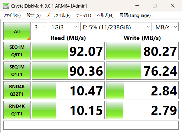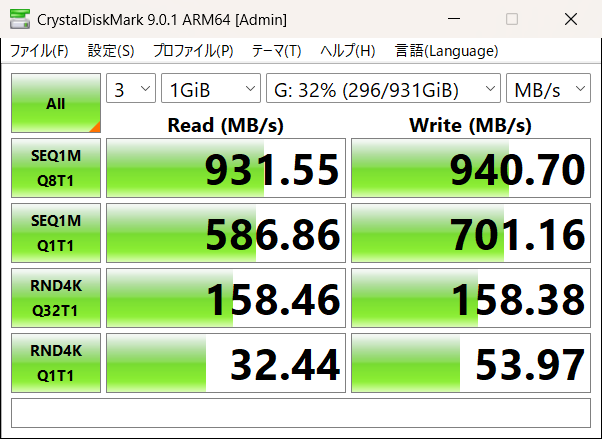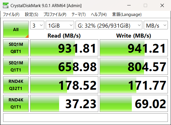 ストレージ関連の速度については、前面のUSB Type-C、USB Type-AにUSB 3.2 Gen2対応外付けSSDを装着した際にリード930MB/秒、ライト940MB/秒前後を記録。SDメモリーカード、microSDメモリーカードスロットはリード90MB/秒前後、ライトは80~89MB/秒前後となりました。デジカメ、アクションカメラで撮影したデータを素早く読み込みたい場合は、ノートPCにカメラを直結したほうがよいですね。