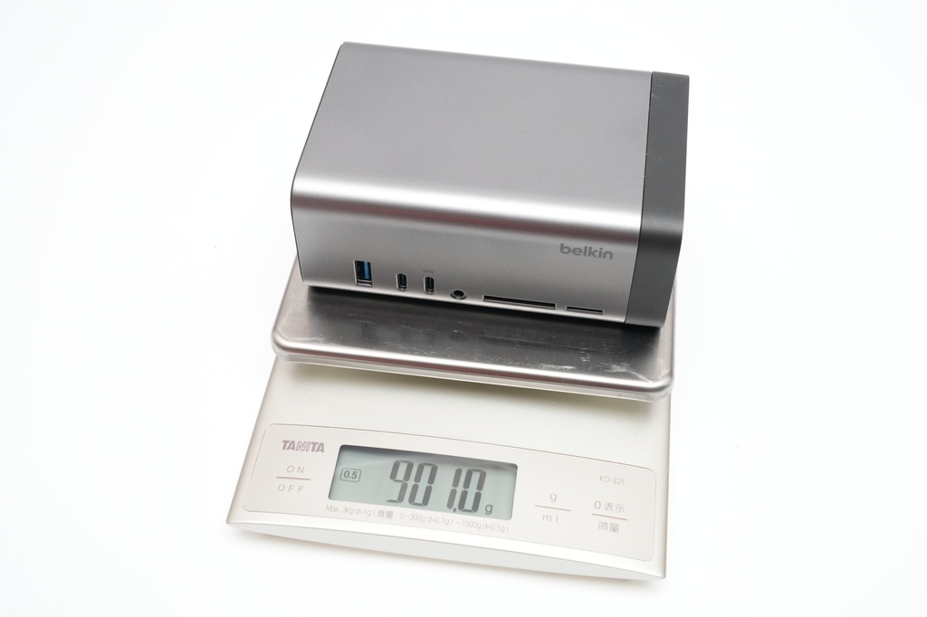 「USB-C 11-in-1 Pro GaNドック(150W)」のサイズは少し大きめ。本体サイズは132(W)×54.25(D)×91(H)mm、重量は実測901g。毎日携帯するというよりは、自宅やオフィスに据え置きし、海外旅行などで使用する際にはスーツケースに忍ばせていく……という位置づけの周辺機器です。個人的には、本体内にSSD用スロットなどが内蔵されていて、SSDを装着することで外付けストレージとしても活用できるとさらに魅力的だと感じました。