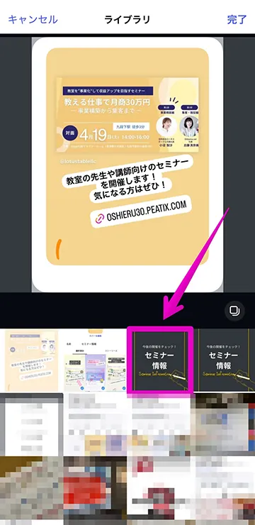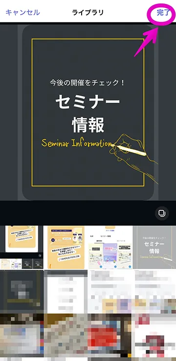 【6】「ライブラリ」画面で候補の画像が表示されたらあらかじめ作成しておいた画像をタップ