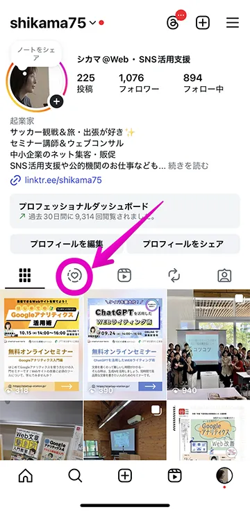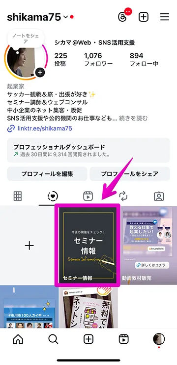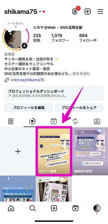【1】Instagramのアプリにログインした状態でプロフィール画面へアクセス、「ハイライト」ボタンをタップ