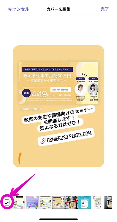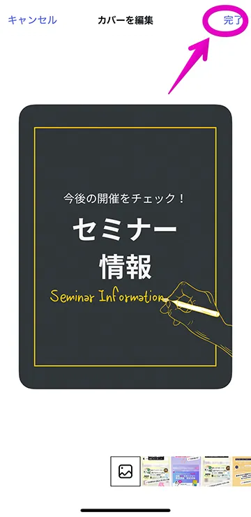 【7】カバー画像の選択が終わったら、右上の「完了」をタップ
