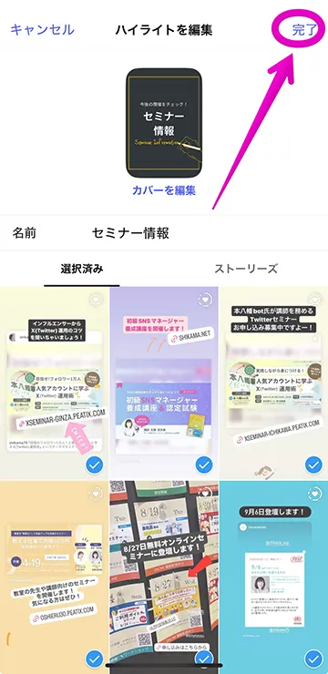 【9】「ハイライトを編集」画面が表示されたら、右上の「完了」をタップ