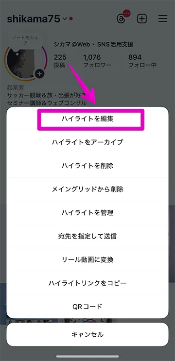 【3】ハイライトを編集するメニューが表示されたら「ハイライトを編集」をタップ