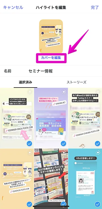 【4】「ハイライトを編集」画面で「カバーを編集」をタップ