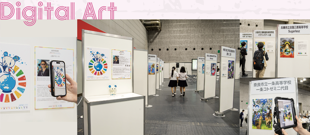 今年で4回目の開催となる「日経STEAMシンポジウム」。大阪会場となるインテックス大阪では、探究学習の内容をポスターで発表し、地域も分野も業種も超えたさまざまな人々から付箋でコメントをもらう「探究ポスター発表 アイデアの泉」や、SDGsの目標から自分達が最も達成したいものを選択し、シンボルキャラクターをデジタルアートソフトで制作し、そのキャラクターのプレゼンをポスターとARで行う「デジタルアート展示・発表会」、文理を問わず若手研究者と語り合える座談会「若手研究者座談会 語り合おう未来のために」、“問い”を立てる大切さと楽しさを体感できる体験型授業を提供する「サントリーSunRiSE『Q to VIEW』“問い”の探究で一変する世界のミカタ」、高校生が入試相談を行える「大学相談コーナー」のほか、大学研究室から普段触ることができない研究機材に直接触ったり操作したりできる「大学体験コーナー」に加え、「DIS特設体験コーナー」では3Dプリンターやドローン、生成AIなどに実際に触れて体験する場が提供され、来場者の姿でにぎわった。