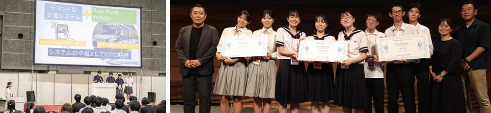 優秀賞に選ばれた愛媛県立松山南高等学校のチーム「Interesting Creative Teaching」は「ICTで変える地方鉄道の未来」と題して、彼らにとって身近な交通手段である鉄道の時刻表を例に挙げ、地方交通インフラの脆弱性を指摘。「車の運転ができなくなる」と“陸の孤島化”が進む地方都市の課題を解決するために、持続可能な交通インフラとして「デマンド型交通システム」と道路と線路の両方を走行できる「Dual Mode Vehicle」(DMV)の二つを組み合わせたサービスを提案した。地方の交通インフラという、日本全国に存在する課題に対して実現可能性の高い提案を行えたポイントが評価され、受賞となった。