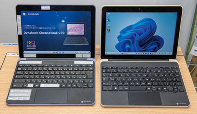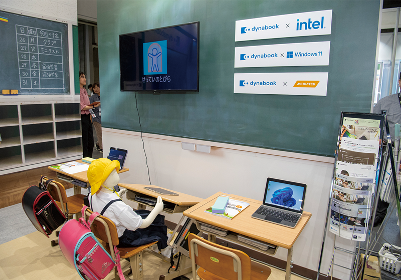 学習者用端末としては、2in1デタッチャブルPCとして、Windows 11 OSを搭載した「dynabook K70」と、ChromeOSを搭載した「Dynabook Chromebook C70」を出展。実際の小学校で使われている机や黒板で教室を模したスペースで展示を行うことで、そのコンパクトさや机での滑りにくさなどをアピールしていた。またこれらの端末には、オプションでハンドル付きの純正ハードケースが用意されているほか、サードパーティー製のケースも豊富に用意されており、校外学習などで屋外に持ち運ぶ場合も安心して使える。
