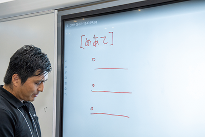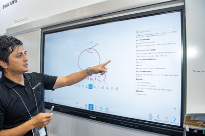 黒板メーカーであり、電子黒板などの教育ICT事業も展開しているサカワ。同社が出展していたのがホワイトボードマーカーで直接書ける電子黒板「かけるくん」StarBoardだ。本製品はその名の通り、ディスプレイにホワイトボードマーカーで直接書いて、奇麗に消すことができる。ホワイトボードモードで書いた筆跡は画像データとして残すことも可能だ。また本製品はAIアシスタントを搭載しており、スタイラスペンで手書きした図形や数式をAIアシスタントに認識させ、解法などを解説してもらうことも可能だという。