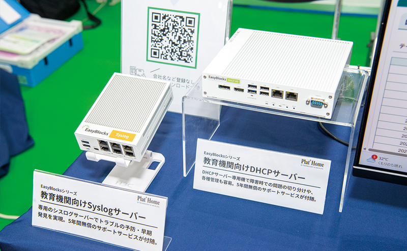 校内ネットワークやICT環境整備の担当者向けにぷらっとホームが訴求していたのが、手間いらずで構築・運用できるネットワークアプライアンスサーバーのEasyBlocksシリーズ。障害時の問題切り分けや各種管理を行える「教育機関向けDHCPサーバー」と、専用のシスログサーバーでトラブルを早期に発見する「教育機関向けSyslogサーバー」を出展していた。いずれも5年間の無償サポートサービスが付随する。