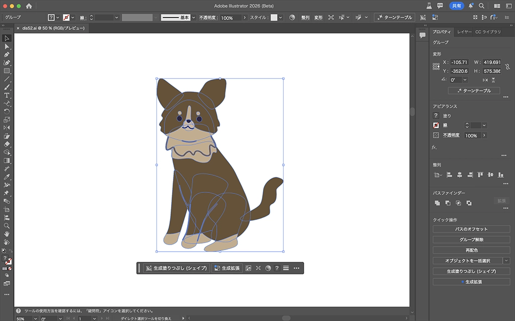 重なり、透過、グラデーションなどの描画が複雑な2Dベクターイラストでは補完精度が低くなる可能性や、出力結果が意図しない変形や歪みを含むケースも報告されています。AI生成の特性上、色の変化が発生してしまうため、最終的には生成されたオブジェクトの確認・調整は必須です。