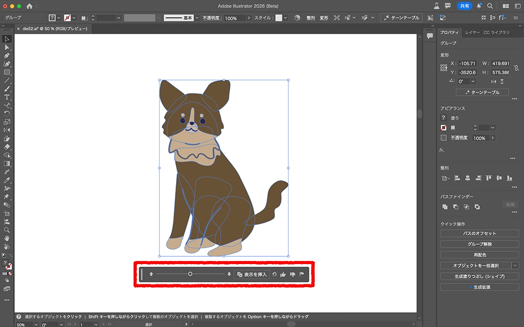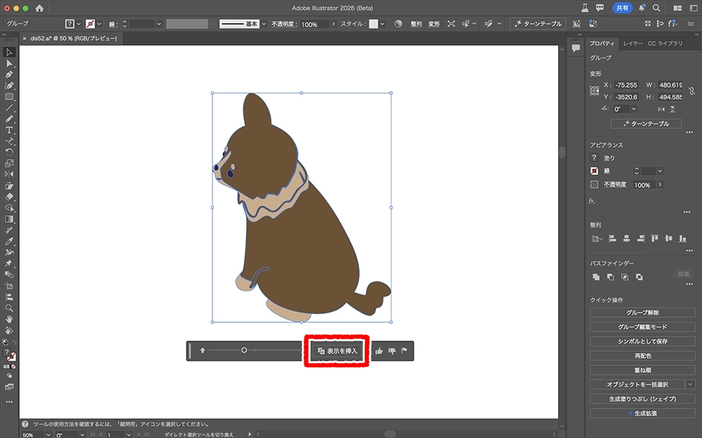 ほしいアングルが決まったら、コンテキストタスクバーの「表示を挿入」ボタンをクリックします。その角度のイラストが新しいベクターオブジェクトとして作成されます。