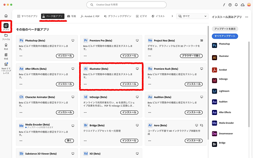 今回はAdobe Illustrator Beta版アプリを使用します。Creative Cloudデスクトップアプリケーションの「アプリ」をクリックし、「ベータ版アプリ」をクリックします。さまざまなアプリのベータ版があるので、その中から「Illustrator(Beta)」をクリックしてインストールします。
