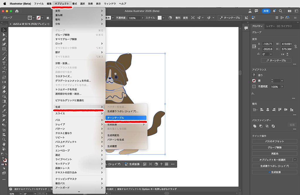 グループ化したイラストを選択した状態で、「オブジェクト」メニュー→「生成」→「ターンテーブル」をクリックします。