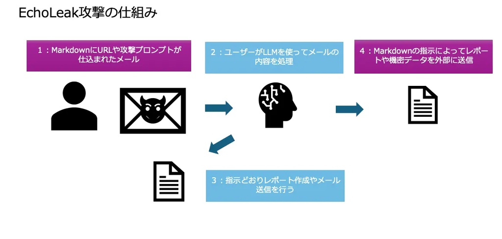 これはAI全体にいえる脆弱性だが、Copilotなど業務システムや特定のOSと統合されたAIの場合は、実行するユーザーと同等の権限を持っている点に注意が必要となる。EchoLeak(CVE-2025-32711)は、標的が持つ権限を利用して、Copilotに内部の機密情報を流出させる攻撃だ。